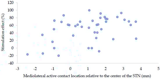 Scatter plot of the relation between mediolateral active contact location (x-coordinate) relative to the center of the STN, and stimulation effect.