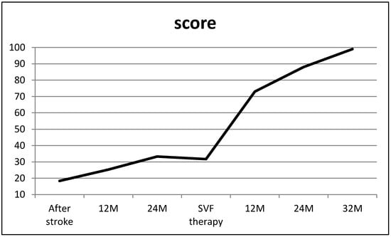 The case history of the 48-year-old male reveals that his quality of life, measured by the modified SS-QOL score, had reached a plateau 12 months prior to SVF therapy (Figure 1). During SVF therapy, the patient, weighing 94 kg and with a height of 175 cm (body mass index (BMI) of 30.69), was treated with approximately 180 million nucleated cells (i.e., 1.89 million SVF cells per kilogram of body weight) isolated from 200 mL of his adipose tissue. No postoperative pain, bleeding, or reactions to the local tumescent anesthesia were noted. After SVF therapy, he continued to engage in physiotherapy at a level of intensity similar to that prior to the procedure. It was recommended, however, that he lose weight by implementing a more plant-based diet. Just two weeks after SVF therapy, the patient reported feeling a reduction of pain and a mild reduction of vertigo. After 3 months, he experienced less fatigue. Moreover, slowly but steadily, he began to walk with support, demonstrating better balance. After 9 months, he was able to walk safely on his own. After 12 months, he was able to stand on one leg, and after 18 months, he was able to lose 18 kg of body weight, reaching a BMI of 28.08. After 24 months, he no longer suffered from balance problems, and he was able to start riding a bicycle again (for the first time in 4.5 years) with no fatigue. Finally, 32 months after SVF therapy, he reported feeling completely healthy with no limitations or handicaps (Figure 1).
