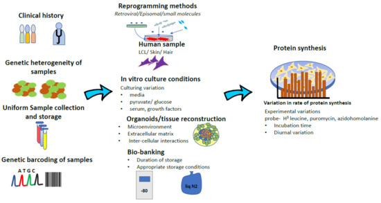 Schematic representation of intrinsic variation at multiple levels (tempo-spatial, tissue, experimental protocols) during development of essential patient derived substrates that influence decisive outcome measures such as protein synthesis.