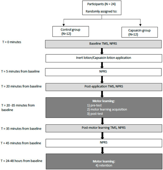 There is evidence that pain negatively impacts the neuroplasticity associated with motor output [1,2] and negates the increases in somatosensory evoked potential (SEP) peaks that would otherwise occur following early motor learning [3,4]. Motor learning is the acquisition of new muscle patterns in order to improve motor performance [5]. Motor learning induces neuroplasticity in the motor cortex (M1): An expansion of motor areas [6,7,8,9] and changes in the kinematics of movements and facilitation of the motor evoked potentials (MEPs) [10,11]. The interactions between pain and motor learning are complicated and few experiments have examined the interactive effect of acute tonic pain and early motor learning on corticospinal excitability (CSE) in healthy humans. In addition, while there is some evidence that pain during motor learning interferes with acquisition [12,13,14], other work has shown no impact of pain on acquisition [15,16,17] and improved acquisition in the presence of acute pain [3,4]. Previous work using a tonic cutaneous pain model demonstrated improved early motor learning with remote acute pain (applied to the same limb) as compared to a control group [3,4] and with local pain as compared to remote pain [4]. Therefore, as the neuroplasticity associated with early motor learning is mediated by alterations in attention [18,19,20,21], these differing outcomes may be attributed to the location (local versus remote) as local pain may help to focus attention on the effector performing the task leading to enhanced performance. In addition, as manipulating arousal through pharmacological means has been shown to improve performance [22], the increase in arousal associated with acute tonic may have a positive impact on motor performance. Another factor may be the type of nociceptive input (muscle versus cutaneous). Experimental muscle pain (induced by the injection of hypertonic saline) tends to increase with movement in certain directions, leading to altered motor control strategies in an effort to avoid the pain [1]. In contrast, cutaneous pain does not increase with movement and therefore does not interfere with motor learning. An acute tonic pain model (capsaicin cream) that does not lead to increased pain with movement was chosen for this study in order to elucidate some of the differences between the type of pain (cutaneous versus muscular) and early motor learning outcomes. The topical application of capsaicin cream is a widely used experimental pain model [23,24,25] that elicits activation in C-nociceptors inducing central sensitization and a region of hyperalgesia [26,27].