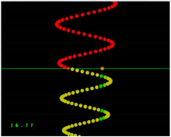A photograph of the motor learning task that was performed by each participant. The traces consist of a series of dots which the participant tracked when the trace passed a horizontal line. The orange dot shows the location of the participant’s cursor along the horizontal line. Motor error was calculated as the average distance that the cursor was from the optimal trace.