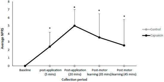Line-graph depicting the average NPRS ratings for the capsaicin and control groups. Significant differences are indicated by asterisks (all p < 0.05). Error bars represent the standard deviation.
