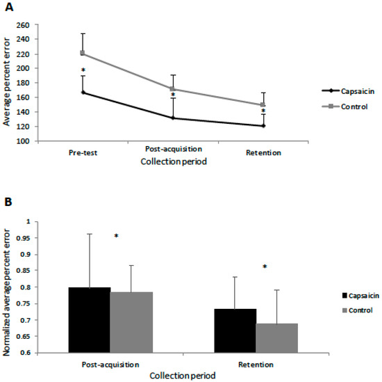(A) Line-graph depicting the average percent motor error (in %) for the capsaicin and control groups. Significant differences between the groups are indicated by asterisks (all p < 0.005). Error bars represent the standard deviation. (B) Bar graph depicting the normalized percent error for the capsaicin and control groups. Significant differences (from pre-test) are indicated by asterisks (all p < 0.005) for both groups post-acquisition and at retention with no significant differences seen between the two groups.