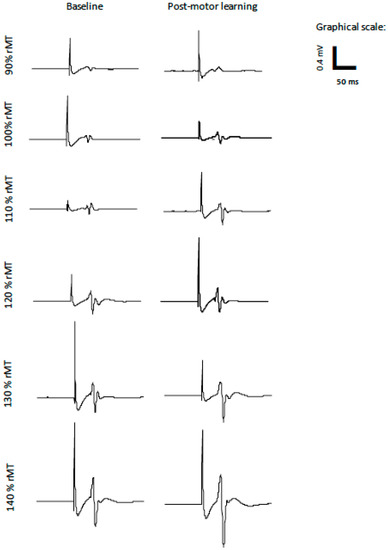 Average MEP data at baseline and post-motor learning from a representative control participant at all stimulation intensities (90% rMT–140% rMT).