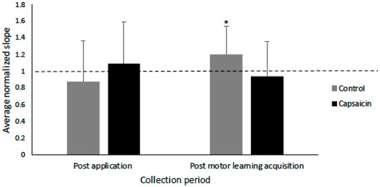 Bar-graph depicting the normalized average slope post-application and post-motor learning acquisition for the control and capsaicin groups. There was a significant increase in slope for the control group (p < 0.05) following motor learning acquisition as indicated by an asterisk. Error bars represent the standard deviation.