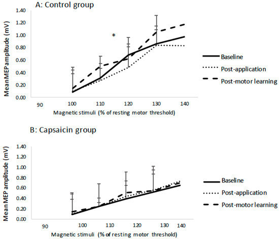 The slope data was normally distributed, and Mauchly’s test of sphericity was not significant. The average R2 value for the capsaicin group was 0.87 and for the control group was 0.84 (see Table 2). There was no effect of TIME on the IO slopes (p = 0.16) following cream application (capsaicin or placebo) or post motor acquisition. However, there was a significant TIME by GROUP interaction (F(2,23) = 3.69, p < 0.05), with post-hoc tests with a Bonferroni correction indicating that following motor acquisition there was a significant increase in slope for the control group (F(1,11) = 3.49, p < 0.05), and no significant change for the capsaicin group (p = 0.59). Figure 5 shows the average MEP data for a representative control participant at all of the stimulation intensities. The average IO slopes are illustrated in Figure 6. Figure 7 depicts example individual IO curves of typical control (A) and capsaicin (B) participants and Figure 8 depicts the mean IO curves for control (A) and capsaicin (B) participants.