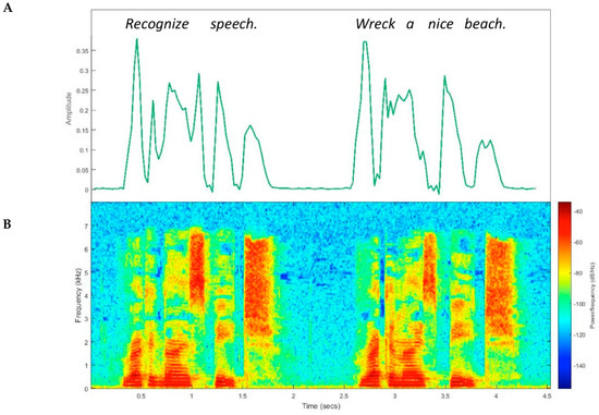 Two representations of an acoustic speech signal: Amplitude envelope (A) and spectrogram (B). Subtle differences between the phrases “recognize speech” and “wreck a nice beach” can be detected in both representations.
