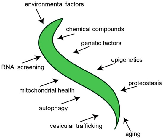 - Van Ham, T.J.; Thijssen, K.L.; Breitling, R.; Hofstra, R.M.W.; Plasterk, R.H.A.; Nollen, E.A.A. C. elegans Model Identifies Genetic Modifiers of α-Synuclein Inclusion Formation During Aging. PLoS Genet. 2008, 4, e1000027. [Google Scholar] [CrossRef] [PubMed]
