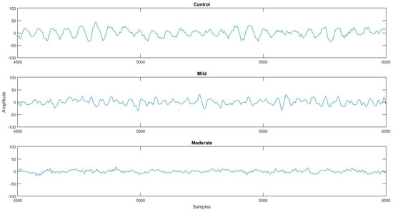 The Nihon Kohden EEG 2100 device provides information about any possible artifacts during each EEG recording (electromyographic artifacts, blinking, and swallowing), which were marked and removed. The EEG signals are preprocessed using a high-pass FIR (Equiripple) digital filter with a cutoff frequency at 0.5 Hz to remove low frequencies around 0. Furthermore, a Butterworth notch filter was designed at 50 Hz to remove the 50 Hz power line noise interference from the EEG signals. The EEG recordings were filtered to the frequency range 0.5–60 Hz. In Figure 1, a plot of the O1 channel of three different subjects (control, mild AD patient, and moderate AD patient) is presented.
