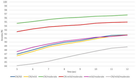 The best window length is 12 s for all classification problems with the classification accuracy ranging from 88.79% to 96.76% for the CN/mild/moderate and CN/moderate problems. The CN-mild/moderate problem indicates the second highest value of accuracy (94.99%), followed by CN/AD (91.80%), CN/mild (91.77%), and mild/moderate (91.71%). On the other hand, the worst classification results are obtained for epochs of 5 s. Likewise, CN/moderate shows the highest accuracy (94.68%), followed by the CN-mild/moderate (92.59%), mild/moderate (87.63%), CN/AD (86.98%), CN/mild (86.60%), and the 3-class problem CN/mild/moderate that succeeded the worst accuracy (82.34%). The classification accuracies for epochs of 6, 7, 8, 9, 10, and 11 s are gradually increased.