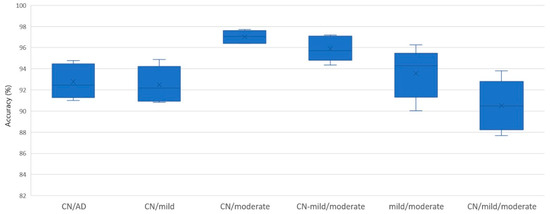 The distribution of the accuracy results in each cluster for the 5 classification problems: The abbreviation CN stands for Controls and AD stands for Alzheimer’s Disease.