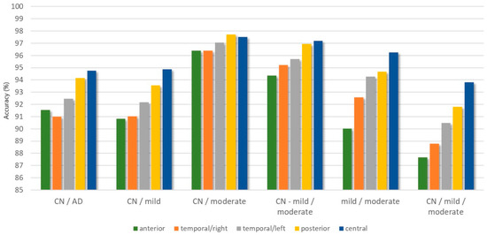 The classification of Alzheimer’s concerning controls group (CN/AD) presents good classification results with accuracies ranging from 90.99% to 94.76% (temporal/right, anterior, temporal/left, posterior, and central), with kappa statistics from 0.8194 to 0.8936, and with F1-scores from 0.9148 to 0.9534. The worst classification performance is obtained for the 3-class problem (CN/mild/moderate) with an accuracy ranging from 87.67% to 93.80%, with kappa from 0.7861 to 0.8930, and with an F1-score from 0.8041 to 0.9051 for the anterior cluster, the right side of the temporal region, the left side of the temporal region, the posterior region, and the central region. A visualization of the obtained accuracy range for each classification problem is depicted in Figure 3. Figure 4 represents the classification accuracy in each cluster for each classification problem.