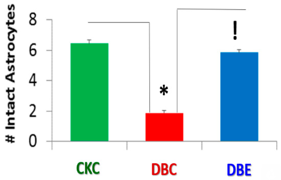 In previous publications, we had only shared our marked observational findings regarding the detachment, separation, and retraction of ACfp and felt it was necessary to focus on the possibilities of performing a semiquantitative study regarding the number of ACfp tightly adhered in control CKC and detached and separated in DBC and to determine semiquantitatively the number of tightly adhered ACfp/NVU in empagliflozin-treated DBC. The current study demonstrated a significant loss in the number of intact ACfp/NVU in untreated diabetic DBC as compared to the control CKD (6.45 ± 1.1 ACfp/NVU in CKC as compared to 1.88 ± 0.72 ACfp/NVU in DBC) (p < 0.05), and the protection with an empagliflozin treatment of DBC resulted in 5.86 ± 0.88 ACfp/NVU in DBE (p < 0.05) (Figure 1).