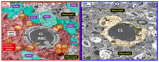 The separation, detachment, and retraction of astrocyte end-feet foot processes (ACfp) in female diabetic DBC with a loss in the connectivity to regional neurons: (A and B) Representative images of the neurovascular units (NVU) with ACfp–drAC (detached, retracted, and separated) (pseudo-colored cyan). Both images depict a basement-membrane (BM) thickening with aberrant mitochondria (aMt) pseudo-colored yellow with encircling red lines. Incidentally, aMt may be a source of reactive oxygen species (ROS). Note the invading activated MGCs (aMGC) (pseudo-colored red). In Figure 7A, the activated microglia (aMGC) has totally encompassed the NVU, while in Figure 7B, it has not quite completely undergone total invasion. Note the white dashed double arrows in each image denoting these separations of the drACs (ranging from 0.2 to 2 micrometers) from the NVU BMs. These separations of ACfp–drACs could definitely interrupt and result in a loss of neurovascular coupling with regional neurons resulting in an impaired cerebral blood flow with ischemia and hypometabolism to regional neurons. Additionally, this separation of ACfp–drAC from NVU could result in an impaired cellular crosstalk between regional neurons and their NVUs in addition to the separation of the drAC crosstalk with vascular mural cells and could result in an increased permeability. aMGC = activated microglia cell; aMt = aberrant mitochondria; Cl = capillary lumen; EC N = endothelial cell nucleus; drAC = detached astrocyte; RBC = red blood cell; Available via license CC BY 4.0.