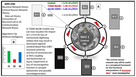 Because cells do not exist in decimal points but only in complete cells, the rounded mean number of six ACfp/NVU in CKC and DBE immediately brought to mind the highly discussed and debated “6 degrees of separation” theory that was initially entertained by Janos Szentagothai (1912–1994); the noted Hungarian neuroanatomist, electron microscopist, and neuroendocrinologist contributed to the “six degrees of separation” theory and proposed that each neuron was able to contact any other neuron with no more than six interneuronal connections. Szentagothai also promoted the cerebral cortical neuronal network via the “module-concept” and shared the following: “The cortical neuron network may still be useful as a conceptual framework for the functional interpretation of structural data.” [9]. In retrospect, this noted Hungarian was able to begin the thought process of today’s neuronal network theory and how this may possibly apply to artificial intelligence. Therefore, now it becomes plausible to also consider the “6 degrees of separation” theory-hypothesis in ACfp/NVU connections, since the mean rounded number of ACfp/NVU were six in CKC and six ACs/NVU in DBE but only 2 AC/NVU in the diabetic DBC. Furthermore, the loss of four ACfp/NVU in the DBC could have a huge negative impact on neurovascular coupling and CBF to regional neuronal activity with resulting hypoperfusion, hypometabolism, and possibly impaired cognition and neuronal dysfunction—neurodegeneration (Figure 6).