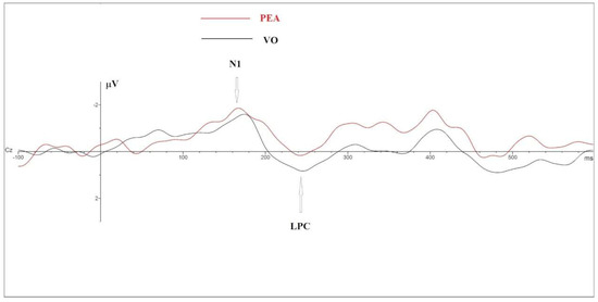 Cz–Grand Average comparison between OERP components elicited during phenylethyl alcohol (PEA) (red line) and Vaseline Oil (black line).