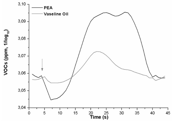 Grand average curves of the volatile organic compounds (VOCs) response to PEA (black) and Vaseline oil (grey). The exhaled VOCs metabolic response is about 8 s delayed, by the stimulus administration (arrow), and the recovery occurs after about 20 s.