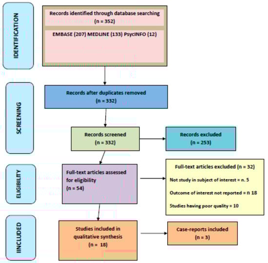As reported in Figure 1, the initial search yielded 352 articles, of which 253 articles were excluded based on the title and abstract review. A total of 54 articles underwent a full-length review, and 32 articles were excluded (not a study in subject of interest = 5; studies having poor quality = 10; no outcome of interest = 18). Data were extracted from 18 studies and 3 case-reports, involving a total of 6196 subjects.