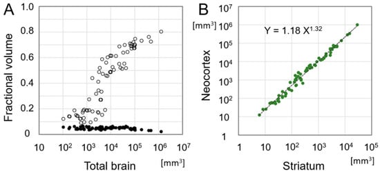 Brain size expanded dramatically during mammalian evolution [94,95,96]. What happened to the size of each component? We plotted the fractional volume of the neocortex and the striatum as an exponential function of the total brain volume (Figure 2) according to the data presented by Stephan et al. [94], who measured the volume of each brain structure in 76 species from insectivorous mammals to human. We found that the striatal fraction is relatively constant (0.049 ± 0.009) whereas the neocortical fraction exhibited remarkable expansion from 0.1 in insectivorous mammals to 0.8 in human (Figure 2) [95]. Using the same data, we performed a nonlinear fit that revealed that the relationship between the cortex and the striatum was well described by a power law with an exponent as previously described in the thalamo-cortical volume relationship [96]. The striatal volume has expanded as a constant fraction within the brain as it underwent exponential expansion during mammalian evolution. The neocortex has progressively occupied a larger part of the brain, indicating that the volume expansion of the neocortex was much more explosive compared to the striatum. Given that virtually all cortical areas send axons to the striatum, the convergence of information through the cortico-striatal projection may have been exponentially enhanced during the course of mammalian evolution.