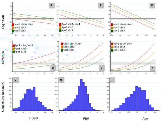 The association of the distribution of High Density Lipoprotein (HDL) ratio (HDL-R), Plasmalogen Biosynthesis value (PBV) and age with probability of dementia and cognition in Apolipoprotein E (APOE) ε2ε3, ε3ε3 and ε3ε4/ε4ε4 carriers. (A) Effect of HDL-R on cognition in different APOE genotypes; (B) Effect of PBV on cognition in different APOE genotypes; (C) Effect of age on cognition in different APOE genotypes; (D) Effect of HDL-R on probability of dementia in different APOE genotypes; (E) Effect of PBV on probability of dementia in different APOE genotypes; (F) Effect of age on probability of dementia in different APOE genotypes; (G) Distribution of HDL-R in the study cohort; (H) Distribution of PBV in the study cohort; (I) Distribution of age in the study cohort. Multiple regression analysis was carried out to determine the association of the distribution of HDL ratio, PBV, and age with dementia and cognition in the study cohort. Cognition was measured as global cognition score (GCOG), which is the average of z-scores from a battery of cognitive measurements. Mean normalized, log10 transformed values of HDL-R, PBV, and mean-centered values of age are in the x-axes. y-axes represent GCOG in the graphs depicting the associations of cognition with HDL-R (A), PBV (B) and age (C); in the graphs depicting dementia (D–F), y-axes represent the probability of dementia as a fraction. In the distribution graphs (G–I), y-axes represent the number of individuals. HDL-R: HDL-C to total cholesterol ratio; PBV: Plasmalogen Biosynthesis value.