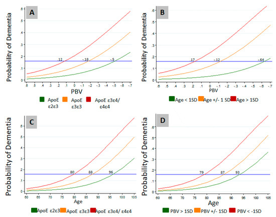 Modulation of the effects of age and APOE genotype on the probability of dementia by PBV is further illustrated in Figure 2. Probability of dementia approached zero irrespective of the genotype when the PBV index is numerically higher (Figure 2A). Similarly, while higher age increased dementia probability, the probability of dementia approached zero irrespective of the age at higher PBVs (Figure 2B). These results suggest that higher PBV is protective even when other risk factors are present. As expected, another well-known protective factor, the presence of APOE ε2ε3 allele, appeared to be also shielding against the effect of age on the probability of dementia (Figure 2C). Consequently, APOE ε2ε3 lowered the probability of dementia by an age equivalent to approximately 16 years compared to APOE ε3ε4/ε4ε4 carriers (Figure 2C). In comparison, higher PBV (>1 SD), was protective against the effect of age on the probability of dementia by an age equivalent to approximately 14 years compared to lower PBV (< 1 SD) (Figure 2D).