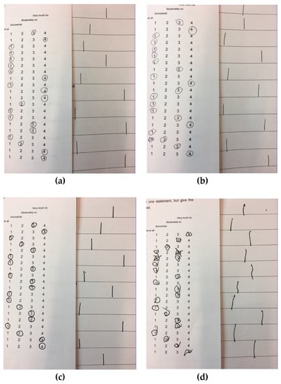 Difficulty in motor coordination and indecisiveness. (a) Before placebo administration; (b) After placebo administration; (c) Before delta-9-tetrahydrocannabinol administration; (d) After delta-9-tetrahydrocannabinol administration.