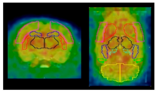 Axial and coronal positron emission tomography (PET) images with volume of interest (VOI) template (W. Schiffer). Red line area indicated the striatum. Pink line area (the cerebral cortex), black line area (the thalamus), blue line area (the hippocampus), and yellow line area (the cerebellum) were also shown.