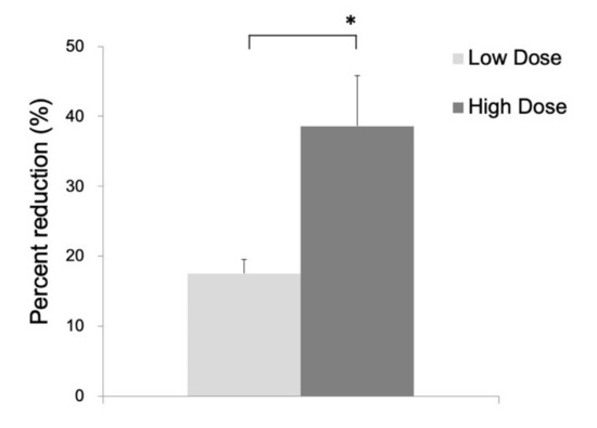 Percent reduction of 14C-acetate in the ipsilateral as compared to the contralateral side in the low-dose group (17.5 ± 2.0%) and high-dose group (38.6 ± 7.2%). Data are expressed as mean ± standard deviation. (*, p < 0.05).