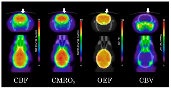 - Watabe, T.; Shimosegawa, E.; Watabe, H.; Kanai, Y.; Hanaoka, K.; Ueguchi, T.; Isohashi, K.; Kato, H.; Tatsumi, M.; Hatazawa, J. Quantitative evaluation of cerebral blood flow and oxygen metabolism in normal anesthetized rats: 15O-labeled gas inhalation PET with MRI Fusion. J. Nucl. Med. 2013, 54, 283–290. [Google Scholar] [CrossRef] [PubMed][Green Version]