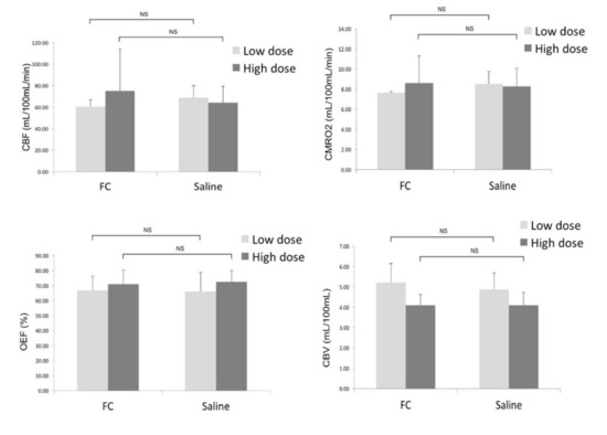 Comparison of the CBF, CMRO2, OEF, and CBV between the ipsilateral side (FC injection) and contralateral (saline injection) sides. Data are expressed as mean ± standard deviation. (NS: not significant).