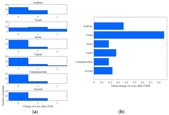 Mean changes in CRS-R score subscales in MCS group: (a) mean change into CRS-R subscales after rTMS course; (b) improvements were observed in subscores.