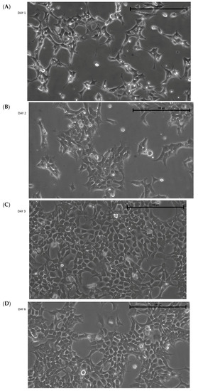 Morphology of IMhu. (A–D) Morphology of IMhu cells, observed by phase-contrast microscopy on days 1, 2, 3, and 6 after thawing. Magnitude 20×.
