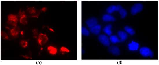 CD11b staining in IMhu. Cells were stained with antibodies against the CD11b surface antigen. (A) Panel A shows positive staining for CD11b and (B) panel B shows nuclear DAPI staining. Magnitude 40×.