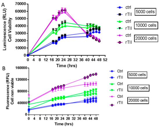 Evaluation of cell viability and cell mortality of IMhu Cells. Panel (A) shows the growth of IMhu cell line under basal conditions in plain growth media and in the presence of TII with different number of seeded cells. Panel (B) shows cell mortality, respectively, in the presence of the indicated treatment. The fluorescence data indicates the non-viable cells, whereas the luminescence data indicates the viable cells. Two-way ANOVA analysis was carried out.