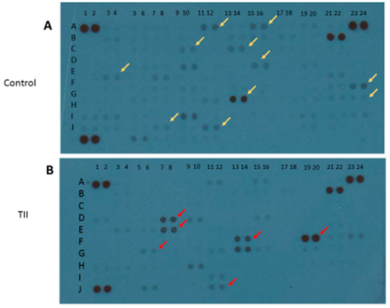 Qualitative analysis of multiple cytokines, chemokines, growth factors, and other soluble proteins in cellular lysates of IMhu after TII stimulation. Panel (A) shows the results from control group, and panel (B) shows the results from TII group. Yellow arrows indicate the down-regulated factors; red arrows indicate the up-regulated factors.