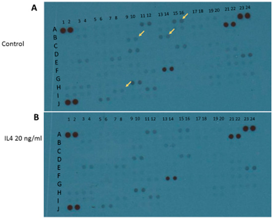Qualitative analysis of multiple cytokines, chemokines, growth factors, and other soluble proteins in cellular lysates of IMhu after IL4 stimulation. Panel (A) shows the results from control group and panel (B) shows the results from IL4 group. Yellow arrows indicate the down-regulated factors.