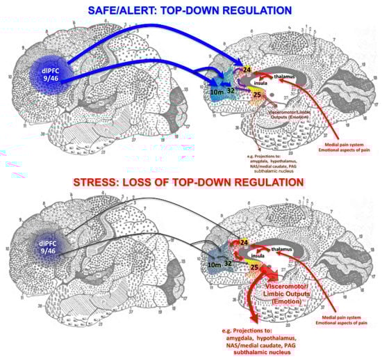 Schematic diagram of prefrontal cortex (PFC) circuits providing top-down regulation of emotion, and the effects of arousal state on connectivity. (Top): Under non-stress conditions, newly evolved dorsolateral PFC (dlPFC) and rostral areas (e.g., BA10) project back to anterior (BA24) and subgenual (BA25) cingulate via BA32 to regulate visceromotor output and emotional response. Note that these cingulate areas are part of the pathway that mediates the emotional aspects of the pain response. (Bottom): Under conditions of uncontrollable stress, the connectivity of dlPFC and the rostral aspect of medial PFC are weakened, and the top-down suppression of BA25 is diminished, promoting activation of subcortical structures such as the amygdala. Anatomical projections are based on tracing studies in monkeys [38], but are portrayed on a Brodmann drawing of the human brain to facilitate translation to human brain imaging results.