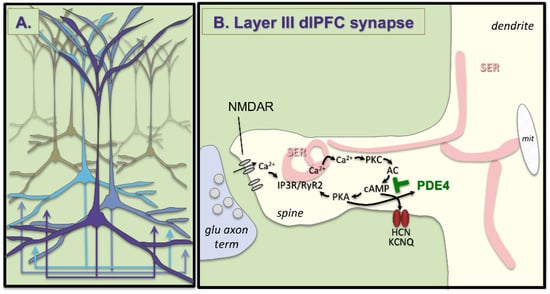 Neuromodulation layer III dlPFC pyramidal cells also have unique neuromodulatory influences, where calcium-cAMP signaling weakens connections by opening potassium (K+) channels on spines. We have proposed that calcium plays a critical, negative feedback role in these recurrent excitatory circuits where there is little feedback inhibition, and thus may prevent excessive neuronal firing [6]. We see evidence of feedforward calcium-cAMP signaling in spines near K+ channels that are regulated by calcium itself (e.g., SK channels [53]), or by cAMP-PKA signaling (HCN and KCNQ channels) [6,54,55]. As schematized in Figure 2B, layer III dlPFC spines have extensive smooth endoplasmic reticulum (SER), which stores and releases calcium into the cytosol (the SER is called the spine apparatus where it extends and elaborates in the spine). In layer III of dlPFC, the spine apparatus is the focus of extensive cAMP-signaling machinery [54,56,57,58], consistent with feedforward calcium-cAMP signaling. Thus, calcium release can drive the production of cAMP, which activates PKA, which drives further calcium release [55]. Feedforward signaling promotes a rapid build-up of calcium-cAMP-PKA activity to open K+ channels and reduce firing. These detrimental actions are prevented under optimal arousal conditions by NE stimulation of α2A-AR [54] and NAAG/glutamate stimulation of mGluR3 [59]. These receptors are concentrated on layer III dlPFC post-synaptic spines where they inhibit cAMP signaling, close K+ channels, and enhance firing. Under healthy conditions, PKA also activates the phosphodiesterases (e.g., PDE4A) to catabolize cAMP and thus provide brakes on cAMP-calcium signaling after it has been activated. However, this negative feedback is lost with age and with inflammation, as described below.