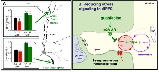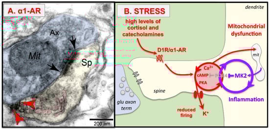 Even mild uncontrollable stress increases catecholamine release in the PFC to drive feedforward calcium-cAMP-K+ signaling and rapidly take the PFC “off-line.” These effects were initially observed in rodent medial PFC, but similar mechanisms have been documented in the primate dlPFC. Due to the early work of Steven Maier, it has long been appreciated that it is the uncontrollable aspect of the stressor that initiates the stress response and leads to cognitive deficits, e.g., Reference [60], and an acute, uncontrollable stress can induce a distracted behavior profile [61]. In contrast, a controllable stressor does not induce dopamine release in the PFC [62]. Biochemical studies documented increased catecholamine release in the rat medial PFC in response to mild uncontrollable stress [63,64,65]. High levels of dopamine (DA) D1R and norepinephrine (NE) α1-AR stimulation in the PFC impair working memory performance by driving feedforward calcium-cAMP-K+ signaling [66,67,68,69], as schematically illustrated in Figure 3. Both α1R (Figure 3A; [70]) and D1R [57,71] have been localized on dendritic spines in layer III of primate dlPFC, and their activation drives feedforward calcium-cAMP signaling (Figure 3B). Thus, stimulation of α1R or D1R reduces the task-related firing of dlPFC neurons in monkeys performing a working memory task, while blockade or closure of HCN channels rescues firing [68,69,70,72]. These stress signaling pathways may interact with neuroinflammation, which may remove the brakes on the stress response by inhibiting PDE4s, as illustrated in Figure 3B. Specifically, in vitro studies have shown that MK2 inflammatory signaling can inhibit PDE4 regulation of the stress response by un-anchoring PDE4s from their correct location and preventing PKA activation of PDE4 negative feedback on the cAMP-PKA response [73,74]. Similar actions in PFC pyramidal cells would accelerate and prolong the response to uncontrollable stress.