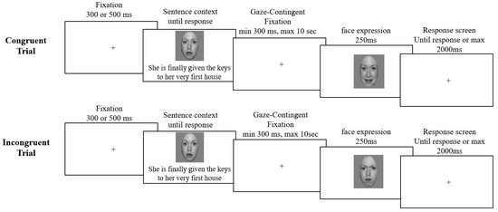 Each task consisted of 320 trials divided into four blocks. In each block, there were four main conditions: positive sentence–happy expression (happy congruent), negative sentence–angry expression (angry congruent), negative sentence–happy expression (happy incongruent), and positive sentence–angry expression (angry incongruent). Within each task, there were 80 trials across blocks for each of the four conditions. Within each block, each model’s facial expression was displayed four times (two congruent trials, and two incongruent trials), and there was a total of 20 trials for each of the main four conditions (10 per gender). The sentence-model pairings were randomized. Prior to each experimental task, participants performed a practice phase that consisted of 16 trials.