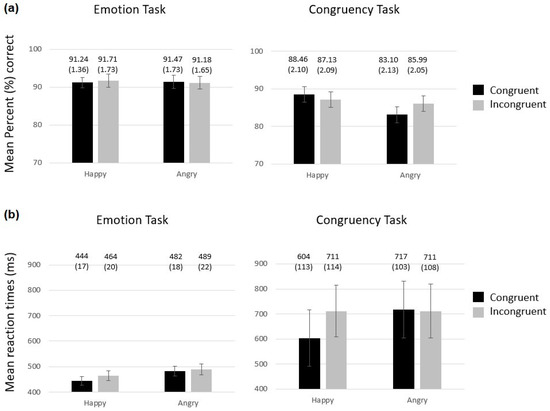 Percentage of correct responses (a) and mean response times (b) for each face emotion (happy or angry) and congruency of that emotion with the preceding sentence, for each task. Condition means (with standard error (SE) of the mean in parenthesis) are reported above each bar. A small effect of congruency was found for angry faces in the congruency task for correct responses and an effect of congruency was found on Response Times (RTs) for happy faces in the congruency task.