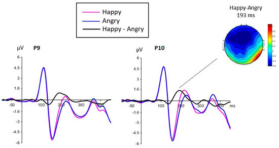 Of secondary importance, the results corresponding to the EPN component showed the significant effect of emotion, with larger negative amplitudes for angry than happy face targets. This effect replicates the results of previous studies that have reported specific sensitivity of this component to faces showing angry compared to happy expressions [24,26]. Interestingly, this emotion effect was found only between 150 and 250 ms, with a peak seen before 200 ms (Figure 3), a result consistent with recent studies investigating fearful expressions [25,36,37].