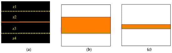 Schematic of the dartboard with target(s): (a) horizontal line target (solid orange) during pretest and Day 2’s tests of learning; zones z1–z4 are denoted in reference to the prediction tasks on Day 2, (b) large horizontal band target presented to the Large-target group, and (c) small horizontal band target presented to the Small-target group during acquisition.