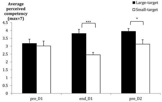 Mean group ratings (SE bars) for perceived competency before Acquisition Day 1 (pre_D1), after Acquisition Day 1 (end_D1), and before retention tests on Day 2 (pre_D2). * p < 0.05; *** p < 0.001.
