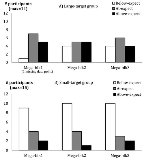 Number of participants performing below expectations (Below-expect), at expectations (At-expect), and above expectations (Above-expect) in the (A) Large-target and (B) Small-target groups as a function of Mega-blocks (Mega-blk) of 30 trials across practice.
