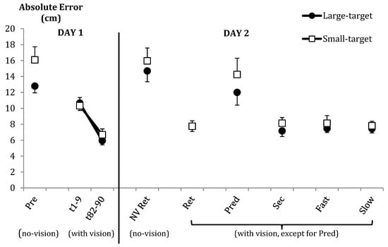 Absolute error (AE) data are illustrated for all phases of the experiment in Figure 4. Unless otherwise indicated, constant error (CE) displayed the same trends as AE throughout the study. There were no group-related differences in either AE or variable error (VE).