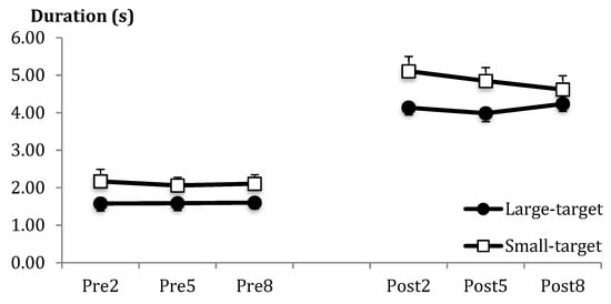 The Small-target group was significantly slower overall than the Large-target group (see Figure 5). Although post-throw duration was longer than pre-throw duration, there were no other effects involving group.