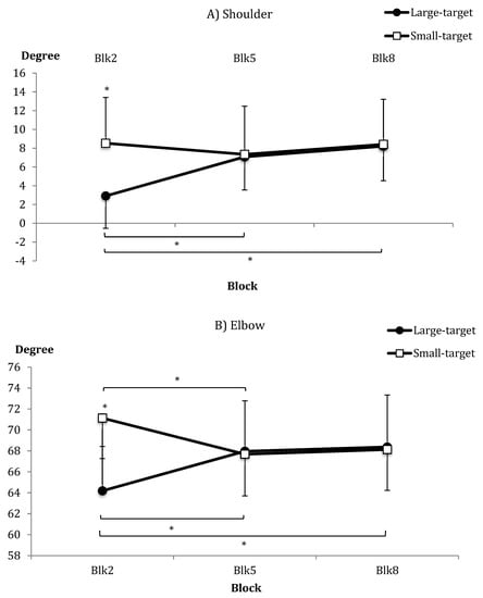 With respect to kinematics, no significant group differences were shown in mean angular velocity and movement time and their SDs. For joint amplitude, the groups were not different overall for either shoulder amplitude or elbow amplitude, and only the shoulder amplitude differed across blocks, indicating an increase in amplitude over practice. There were significant group × block interactions for both shoulder and elbow amplitude (see Figure 6A,B, respectively). Post-hoc analyses indicated group differences only in the early practice block (Block 2), where amplitudes were larger for the Small-target group compared to the Large-target group for shoulder and elbow. The Large-target group showed an increase in shoulder and elbow amplitude from early (Block 2) to end of practice (Block 8; mean change, shoulder = 5.3°; elbow = 4.19°). The Small-target group either showed no change or a significant decrease in elbow amplitude from blocks 2 to 5; see Figure 6B).