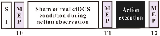The participants received either ctDCS or a sham stimulation, while watching the movement observation video. Movement execution was conducted after the termination of action observation and tDCS. MEPs were recorded before (T0) and after (T1) movement observation combined with the sham or real ctDCS, and then after movement execution (T2). For an overview of the experimental procedure, refer to Figure 1.