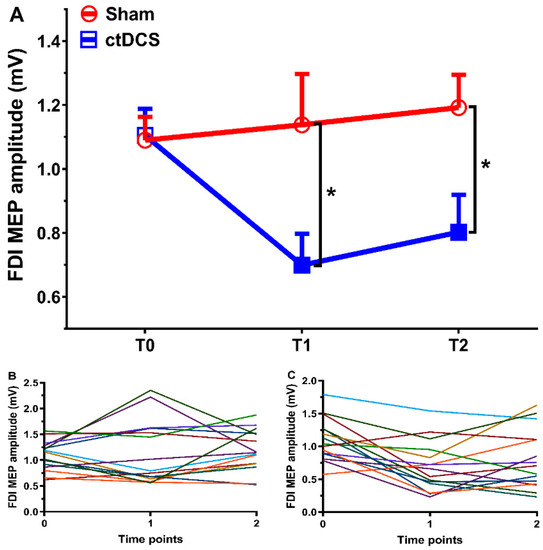 Results of the study. For time points T0, T1, and T2, averaged MEP amplitudes of the first dorsal interosseus (FDI) muscle for all participants (A) and individual MEP amplitude in the sham (B) and cathodal transcranial direct current stimulation (ctDCS) (C) groups are depicted. Filled symbols indicate significant differences of MEP amplitudes after movement observation and execution in comparison to baseline values. Error bars represent standard error of means. * denotes significant differences between groups at p < 0.05.